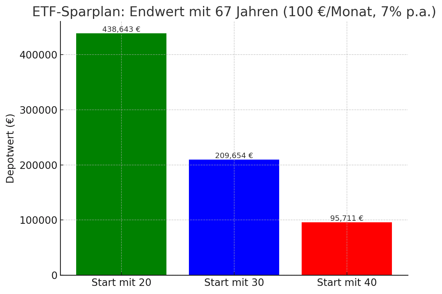 Der Vergleich macht deutlich: Je früher der Einstieg, desto größer das Vermögen im Alter. Schon kleine monatliche Beiträge können langfristig zu einer beachtlichen Summe anwachsen.